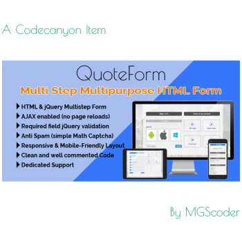 QuoteForm is a Full Responsive Multi Step Multipurpose HTML Form with Required field jQuery validation built on Bootstrap Framework, HTML5/CSS3 and jQuery. Code written in a simple way by which you can easily integrated at your site.