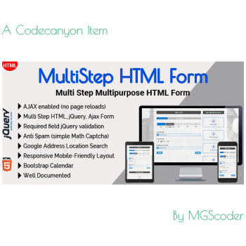 Multistep HTML Form is a Full Responsive Multi Step Multipurpose HTML Form with Required field jQuery validation built on HTML5, CSS3, jQuery and Ajax. Code written in a simple way by which you can easily integrated at your site.