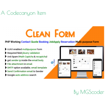Clean Form is a Full Responsive PHP Working Ajax Multi-purpose Form with Required field jQuery validation built on PHP, HTML5, CSS3 and JQuery. Code written in a simple way by which you can easily integrated at your site.