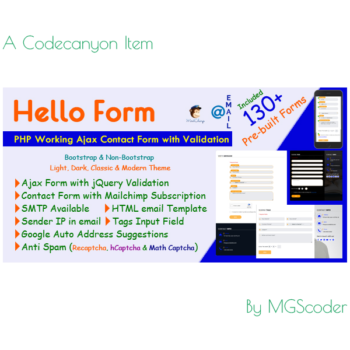 Hello Form is a Full Responsive PHP Working Ajax Contact Form with Required field jQuery validation and Anti Spam (Google reCaptcha & simple Math Captcha) built on PHP, HTML5, CSS3 and JQuery. Code written in a simple way by which you can easily integrated at your site.