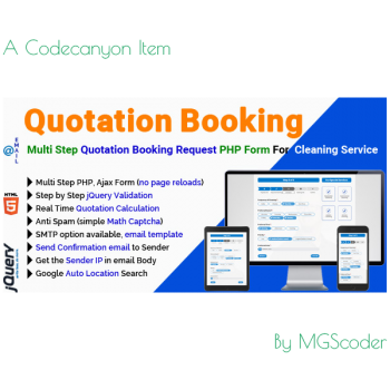 Quotation Booking is a Full Responsive Multi Step PHP Working Online Quotation Ajax Form For Cleaning Service with Required field jQuery validation built on PHP, HTML5, CSS3, jQuery and Ajax. Bootstrap has used for Design Purpose. Code written in a simple way by which you can easily integrated at your site.